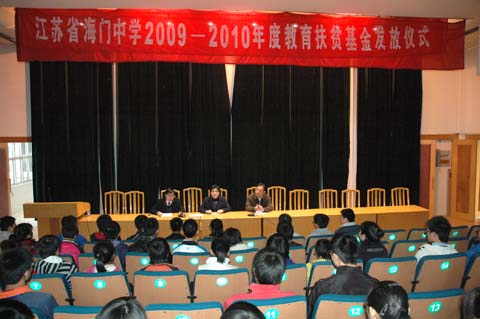 会议由政教处主任助理朱建军主持,他首先介绍了海门中学教育扶贫基金的来源、资助等级、资助范围、享受发放的条件及发放办法,然后由治保室主任黄英明宣读获助学生名单,校长助理王美华为获得金卡资助的学生发放证书。高三(16)班蔡劲松同学代表全体受助学生发言,言语恳切,发自肺腑,各位同学都深受启发。最后校长助理王美华给全体受助学生提出四点希望:一是要学会自信,学会去体验生活;二是学会感恩,学会帮助他人;三是学会奋发,变压力为动力;四是学会传承,勇于挑起爱心的责任。全体受助同学纷纷表示,一定不辜负学校的期望,在以后的学习中更加发奋努力,以最好的成绩向基金会汇报。