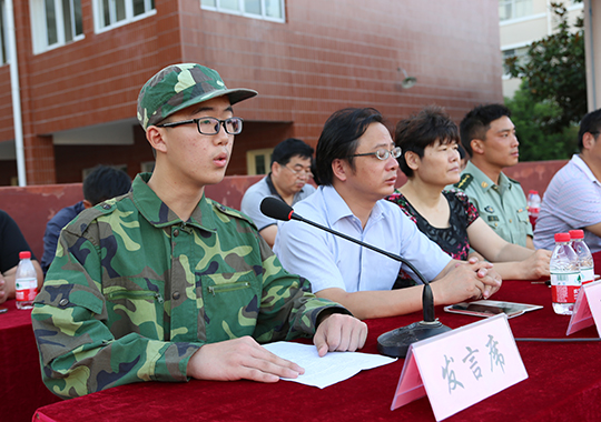 16连汤子昂同学代表全体参训新生讲话,表示一定积极参训,锻炼体魄和意志,增强国防意识,全面提升素养,报效伟大祖国。