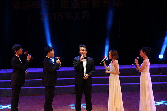 在今年5月接到比赛通知后,我们立即开展了这项工作,今年是抗战胜利70周年,我们在选曲的过程中考虑到了这点,最终确定了排练这首前南斯拉夫电影《桥》中的插曲《啊朋友再见》,并且采用了阿卡贝拉的形式。阿卡贝拉是用纯人声演绎歌曲,对演唱者的音准、乐感要求很高,经过多次的排练、磨合,6月28日我们参加了南通市的中小学文艺展演,当时得了全场最高分,南师大教授有德乡老师点评时对我们的节目给予了肯定,同时也指出了不足,就是学生的音准问题,回去后我们积极进行改进,不断的排练,7月15号南通教育局领导、专家来海指导,提出了修改意见。接下来的日子里我们每天排练,功夫不负有心人,7月29日的比赛,学生们完美演绎了这首作品,我们拿到了全国选拔赛的资格。8月29日上午全国选拔赛在南京艺术学院音乐厅举行,我们的学生第一次登上这么专业的舞台,在人数与没有扩音设备的不利条件下,学生们发挥出色,赢得了专家评委的一致好评。