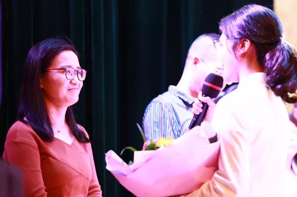 毕业班学子向教师代表、高三年级全体班主任献花。