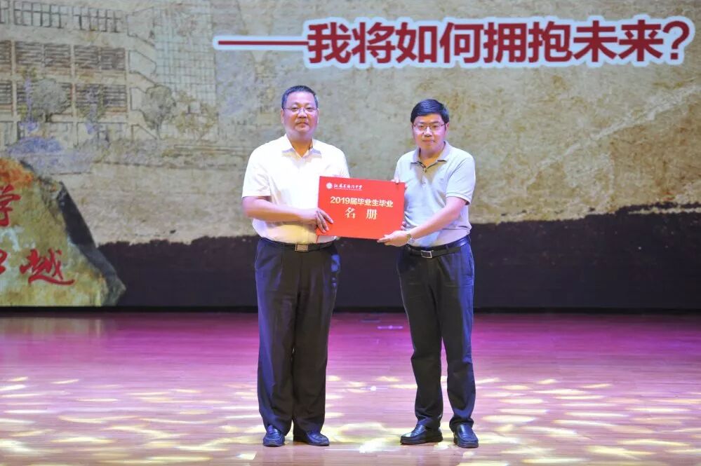 政教处主任、2019届高三年级主任朱建军将学生毕业名册录移交给石鑫校长。