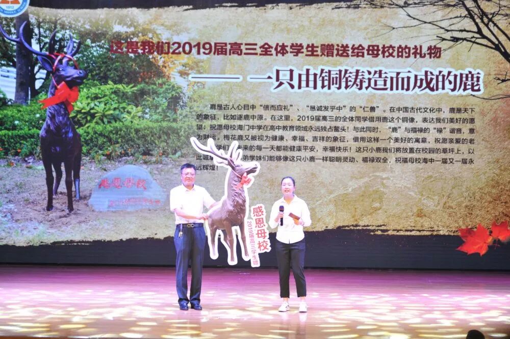 毕业班学子向母校隆重献礼“铜铸梅花鹿”。